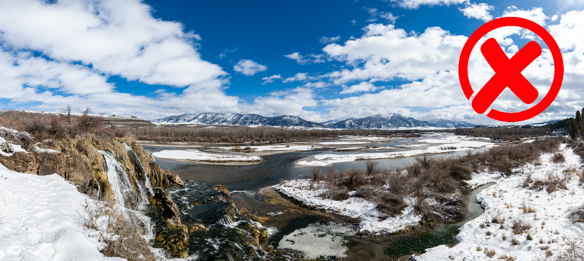 Herold wanted plenty of angle test photos to choose from. The goal with our first trip in Winter was to capture multiple angles of a full panorama. This included trekking off the road in 4 foot deep snow risking accidentally walk into the cliff overhang. Four angles were tested, three were liked, one angle was a clear winner.